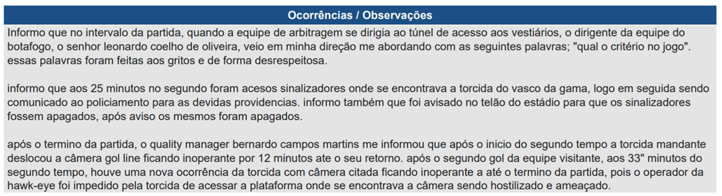 Árbitro diz na súmula que torcida do Vasco deslocou câmera da linha do gol e hostilizou e ameaçou seu operador