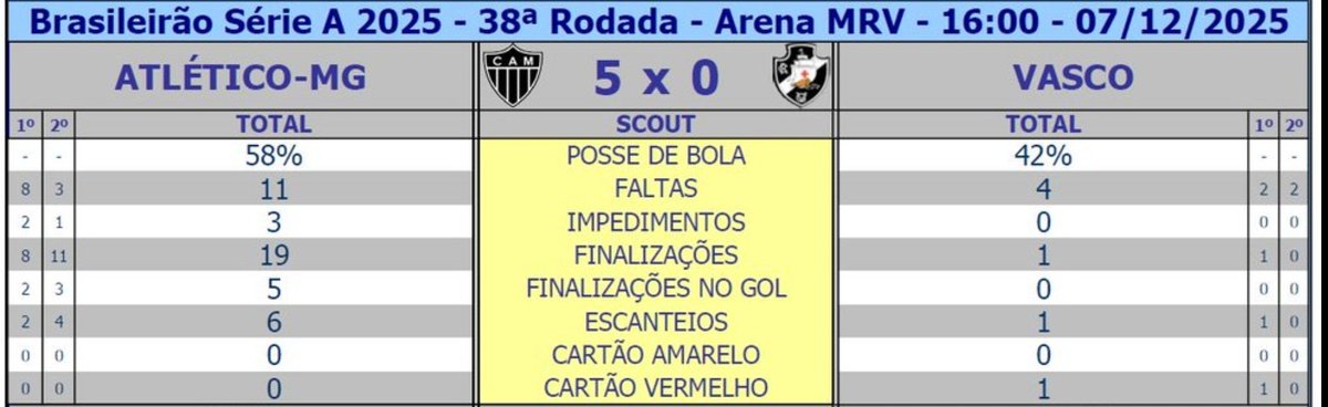 07/12/25 - Confira as estatísticas de Atlético-MG 5 x 0 Vasco