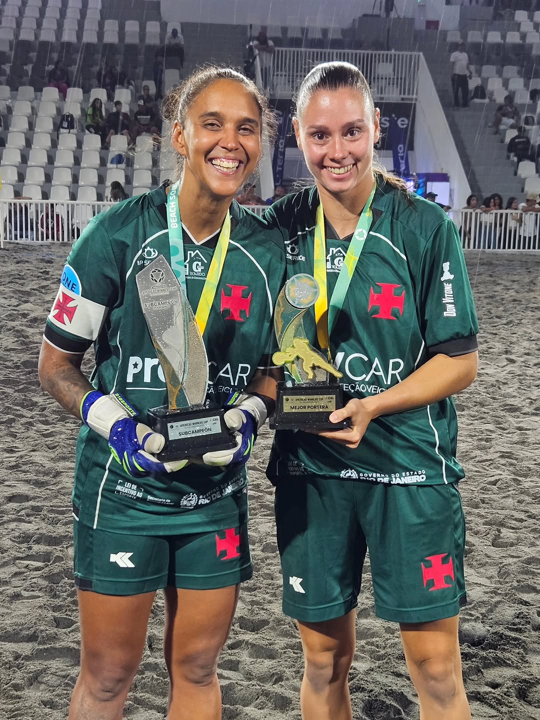Nosso primeiro torneio internacional e já fizemos história! Agradecimentos a minha família @vascobeachsoccer.feminino as atletas que são irmãs pra vida! Alegria e honra em dividir a quadra com cada uma de vcs, estamos tristes mas com a cabeça erguida! Sabemos que demos o nosso máximo em todos os jogos! Fora adversidade de não ter nossa camisa 10 e minha referência @jasnanagel jogamos por vc!;Tivemos a melhor defesa do campeonato, e na minha visão, não tem título individual sem ajuda de todo o coletivo, esse melhor goleira é de todas nós! Em especial a minha parceira de posição @laiagd1 que topou o desafio! Obrigada a nossa incansável comissão técnica @leandroneneca12 que nos preparou pra missão, @thiagoonze que cuida das mídias, @rafinha_amorim_r6 (o doido que topou o desafio de aturar a gente 🤣), @rony_rey_araujo outro doido que tá em todas 🤣, o nosso fisio, que tem que cobrar ingresso (doido TB) @flavioaraujodejesus que me ajeitou pra competição! E ao nosso mais doido de todos, nosso coordenador e meu marido @rec.rafael (só a gente sabe as doideira 🤣). Não posso esquecer do nosso incansável @ricard_reis que me enviou mensagem todos os dias e que respirou o Vasco por muitos anos ao nosso lado, vc faz parte!