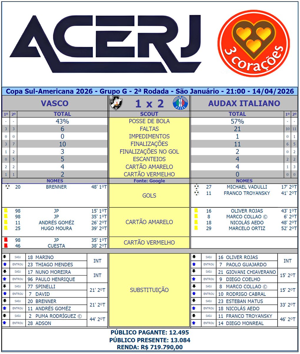 Scout Final de Vasco e Audax Italiano pela 2ª Rodada do Grupo G da Copa Sul-Americana 2026 em São Januário (Fonte: Google) #Acerjinforma #Sudamericana #VASxAUD #VascodaGama #AudaxItaliano @Sudamericana @SudamericanaBR @VascodaGama @audaxitaliano